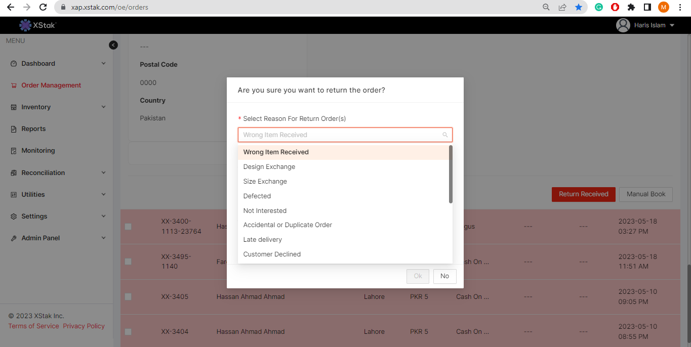 When marking an order as returned through the "Return Accepted" button in the "Pending Return" tab, the following reasons for return should be added at the top: