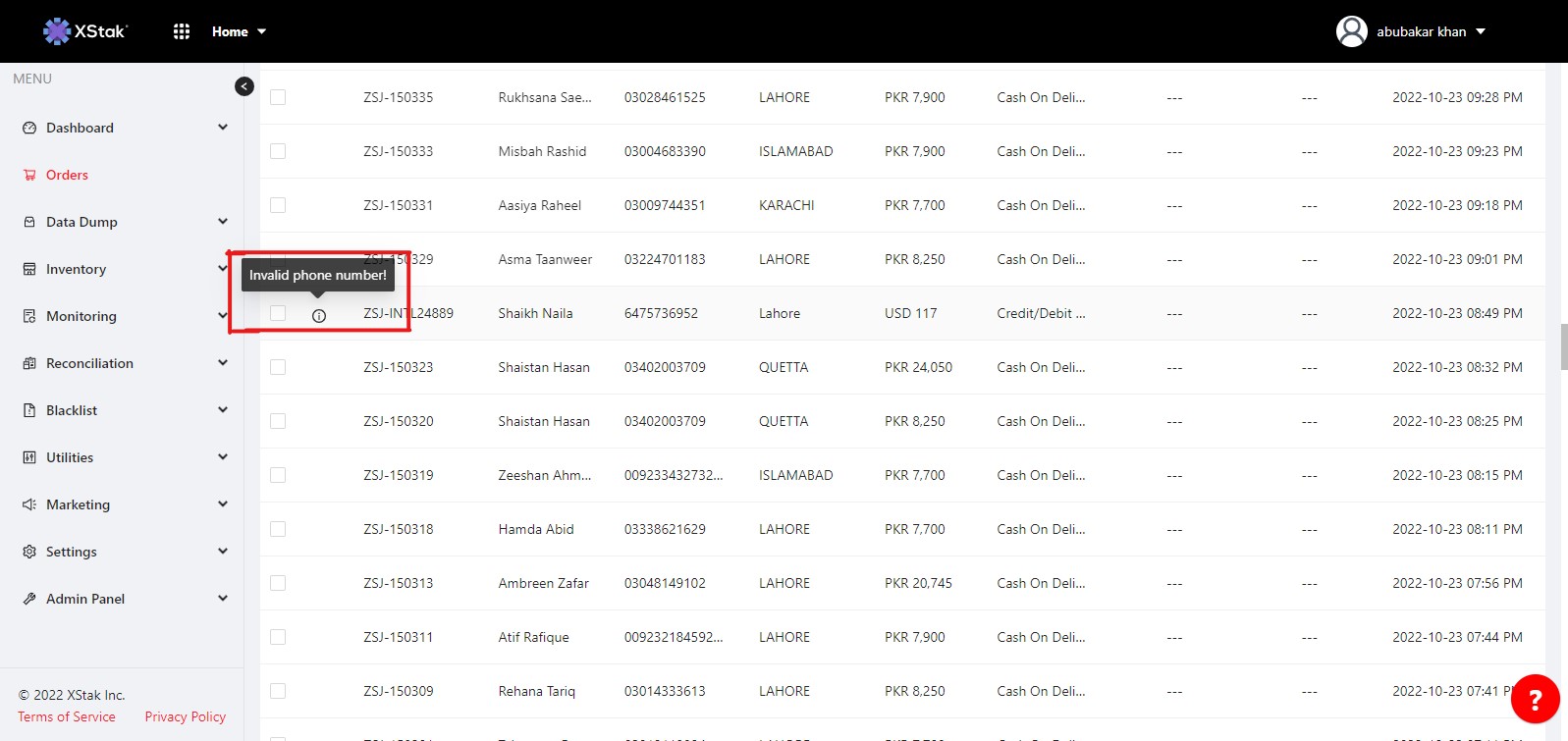 The fix was done for this issue now Orders with invalid number will not move to the next tab.