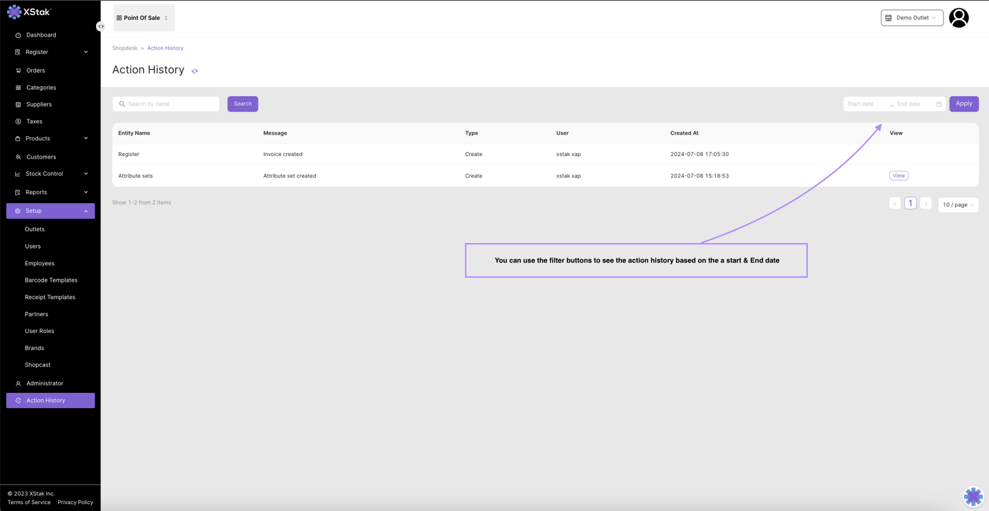Action History is keeping track of all the logs of operations conducted on the POS.