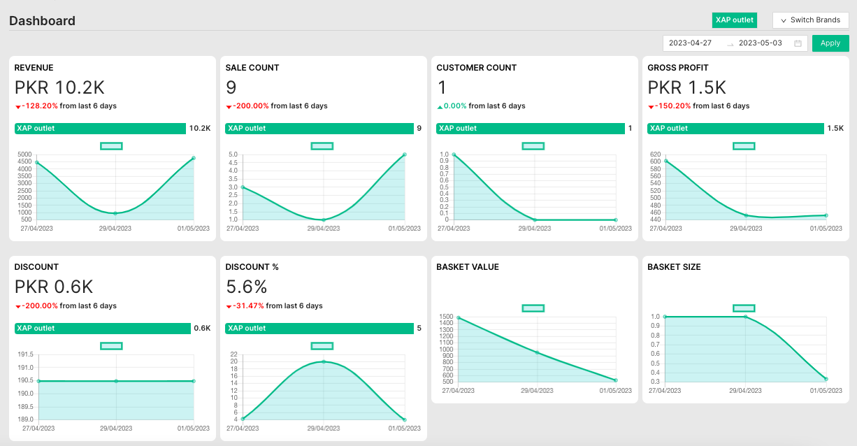 Shopdesk now has a brand new state of the art Analytical Dashboard showing new graphs and data across multiple outlets, Most products sold table and Sales person Data. We can also select our custom date range now to pull our desired analytics.