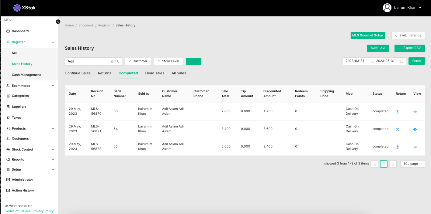 In the Sales history module under register, we can now search for a customer using their Phone number & their name as well. Please see screen shot 3.1 below.