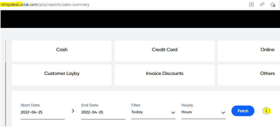 There should be an "info" icon next to the hourly report in Sales Summary that reads "Hourly reports only fetch current date's data".