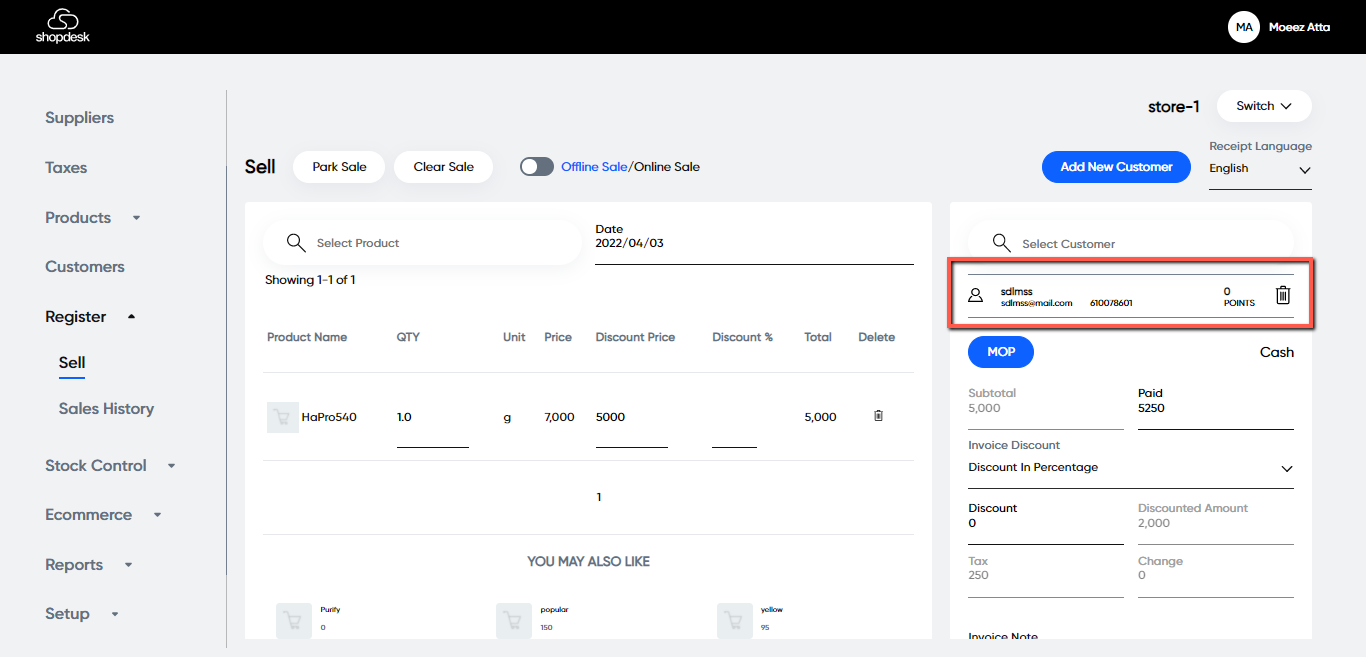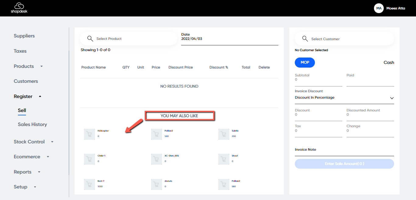 The ShopDesk has been integrated with the Shopcast. Initially, the users can see the top-rated products on the register screen under the “YOU MAY ALSO LIKE” section. By clicking on them, they can be added to the cart. If the user searches for a product, the relevant products will be shown on the screen that can also be added to the cart.