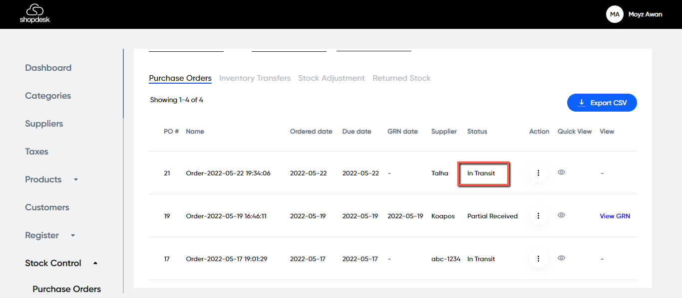 In ShopDesk the user will be able to see the transit quantity of the products in the inventory dump if PO was created against any product. For example, if the user creates a PO against a specific product the In transit qty column in the inventory dump report will tell the user about the qty that is in transit for PO.