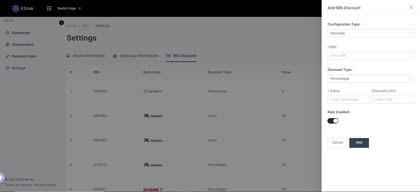 We're thrilled to announce that XPay now supports BIN discounts! With this latest feature, merchants can offer tailored discounts based on card BIN details, sponsored by issuing banks. An effortless way to reward customers and boost sales.