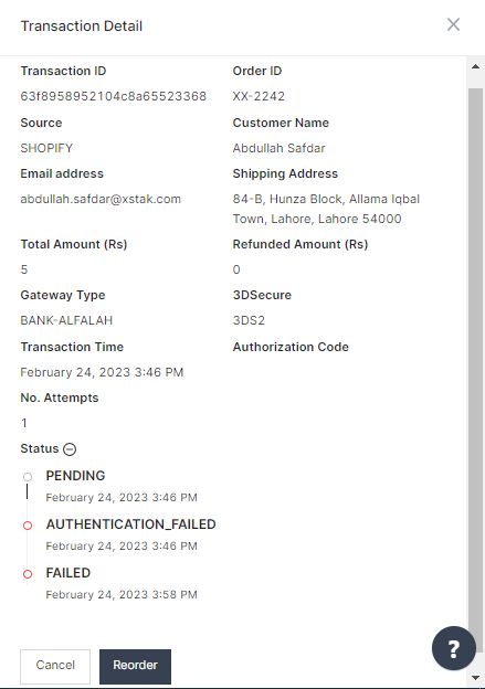 To view the order status history of a transaction, simply go to the transaction details page. From there, in status you will see a clear and concise history of the transaction's status, from the time it was initiated to the final outcome.